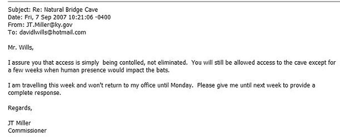 At these meetings, experienced cavers pointed out that within a few miles of the Park there are many caves where bats can find refuge. The officials were told about several local caves where endangered bats have been seen, and were reminded about the huge gated cave, less than 10 miles from the Park, where several thousand Virginias hibernate. The fact that there are several caves located within the Park's boundaries was also discussed, as was the great number of Kentucky caves which have already been closed.